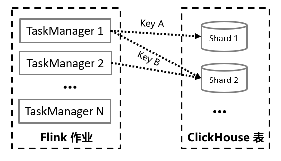 我们知道,写入ClickHouse时,既可以写分布式表,也可以直接写本地表。写分布式表的优点在于不需要关注太多底层节点的细节,但是缺点也很明显:由于数据需要被集中缓存和转发,会增加一定的延时,且会加重短期的数据不一致现象;此外,网络方面压力也较大,连接数和网络流量都会有较大的上升。因此,如果我们要写入的数据量很大的话,可以事先获取各节点的连接地址,通过写本地表的方式直接写入各个节点。写入本地表的方式可以有很多,例如为了防止节点之间出现较为严重的数据倾斜,可在每次写入式随机选择一个节点;也可以采用轮询的方式,每次写入下一个不同节点。如果数据后续要按Key进行聚合,那么还可以使用散列的方式,将相同Key的数据写到同一个节点,如下图所示:
