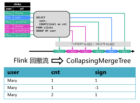 另外我们注意到,流式数据通常会包含大量的更新和删除操作。为了支持频繁变更的数据,可以将Flink的Retract Stream(回撤流)、Upsert Stream(更新-插入流)等含有状态标记的数据流,写入到ClickHouse的 CollapsingMergeTree引擎表中。例如下图(来自Flink官方文档[https://nightlies.apache.org/flink/flink-docs-master/docs/dev/table/concepts/dynamic_tables/])中的GROUP BY查询会随着新数据的写入,对user这个Key的统计值cnt进行持续的更新。当Mary第二次出现时,cnt统计值由1变成了2,那么可以对旧记录发一条sign为-1的消息,和之前那条sign为1的记录相互抵消。然后再写入新的cnt为2的记录。后续Mary第三次出现时,执行同样的操作,即可保证写入ClickHouse的最终统计数据是准确的。