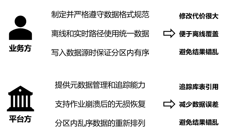当我们完成了对数仓的初步建模和构建后,数据质量验证是决定数仓是否真正可用的关键环节,需要关注的有:一致性、准确性、容错能力、链路延迟等。对于业务方和平台方而言,各自需要关注和保证不同的方面,如下图所示: