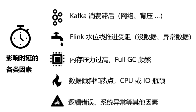 业务方需要尽早制定并严格遵守数据格式(Schema)的规范,因为Flink SQL和很多Connector是不支持运行时动态修改表结构的。如果需要修改,则作业的状态准确度可能受到影响,甚至需要重新跑一遍所有数据,代价很大。此外,对于离线和实时链路,一定要保证数据源的口径是一致的,不然会出现数据“跳变”的问题。对于多分区的数据源(例如Kafka等),还要保证应当将数据有序写入单个分区,否则乱序的数据会影响流处理的精度,造成结果错乱。对于平台提供方,例如我们腾讯云流计算Oceanus而言,需要提供元数据管理等基本能力,避免实际需要修改表结构时,难以追踪多个不同作业之间的依赖关系,造成错漏。同时平台方需要集成Flink自带的状态快照功能,精确保存作业的运行时状态,并在作业发生异常时使用最近的状态来恢复作业,以最大程度地保证计算精度,减少误差的存在。Flink提供的Watermark机制也可以做到一定程度的乱序数据重整,对避免结果错乱也很有帮助。如果从离线数仓或其他版本的数仓系统迁移到实时数仓时,一定要做双写验证,确保新系统的计算结果与原系统保持一致。另外可以使用例如Apache Griffin(https://griffin.apache.org/) 等数据质量监控工具,实现数据异常的发现和告警。对于重点任务,还可以通过热备等方式,避免单个任务由于外部不可控原因而发生崩溃时,引发输出中断等事故。实时数仓相比离线数仓平台,对质量的评价标准还多了一项:链路延迟。如果不能及时得到数据输出的话,这个数仓也是不合格的。而影响链路时延有很多不同因素,例如: