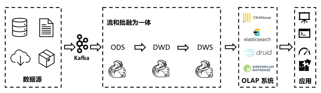应用层承担了各类数据应用的基础设施,例如KV存储(HBase等)、数据库服务(PostgreSQL等)、OLAP服务(ClickHouse等)、搜索服务(Elasticsearch等),为上层的外部应用提供支持。实时数仓的应用层的数据来源于汇总层的各类多维主题宽表和汇总表,例如营销汇总表、活动汇总表、商品汇总表等等。这样,业务方只需要从不同的主题汇总表中读取数据,无需再单独对各类数据源做一整套分析链路。如果宽表字段设计合理,内容足够丰富的话,可以大大缓解开发慢的问题。此外,还可以导出数据接口,以供其他业务部门对接。汇总层的数据是从明细层和维度层关联而来的。由于ClickHouse等OLAP 工具对关联(JOIN)的性能较弱,因此我们可以采用Flink来实现流式数据的高效动态JOIN,并将实时的关联数据定义为宽表并写入ClickHouse以供应用层后续分析查询。由于ClickHouse等OLAP引擎的强劲性能,海量数据的分析慢等问题也可以得到一定程度的解决。明细层通常是经过清洗过滤等规范化操作后的各类主题的事实表,例如订单交易数据、浏览数据等,而维度表则保存了数据中ID与实际字段的映射关系,以及其他变化缓慢但可以用来补充宽表的数据。原始层是对各类数据源的接入映射,例如业务方写入Kafka的各类Topics,以及MySQL等数据库的Binlog等原始数据等等。主要侧重于数据摄取和简单存储,是上面各层的数据来源。由于Flink等流计算平台具有丰富的Connector以对接各种外部系统,且提供了丰富的自定义接口,我们接入各类异构的数据源也不成问题了。
