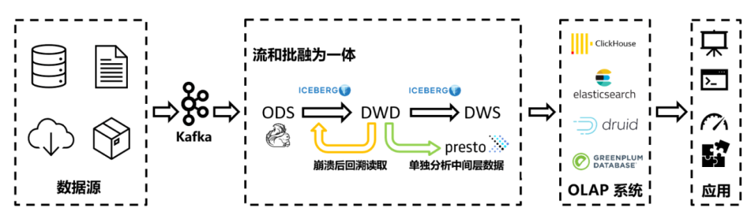 Iceberg同时支持流式读写和批量读写。对于实时链路而言,它可以在一定程度上代替Kafka等传统流式数据管道;对于需要读取中间层的数据等特殊需求,又可以使用常见的批处理分析工具来直接分析Iceberg数据文件,非常便捷。如果流作业发生了崩溃等情形,还可以借助它高效的历史数据回溯能力,快速从特定的时间点开始重新消费数据,如下图: