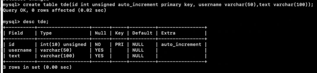 首先,我们在MySQL里面创建一张表。表名为"tde",非常简单的一张表。