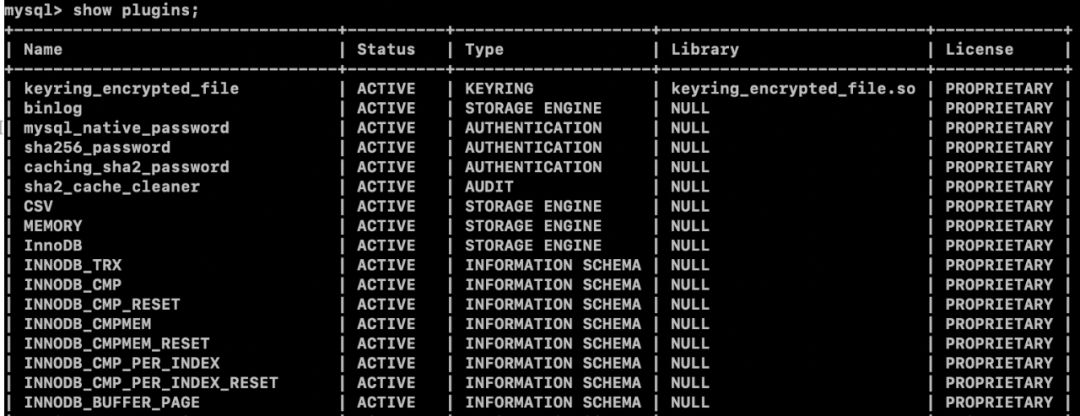 静态数据加密功能依靠MySQL的keyring plugin(暂且叫做钥匙环插件吧,密钥全部保存在钥匙环里,挺形象的)实现。目前,MySQL提供如下插件: