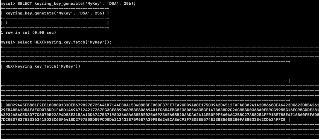 这些UDF用于管理密钥,举个例子看一下,使用kering_key_generate来生成一个密钥,然后再通过keyring_key_fetch查看一下密钥: