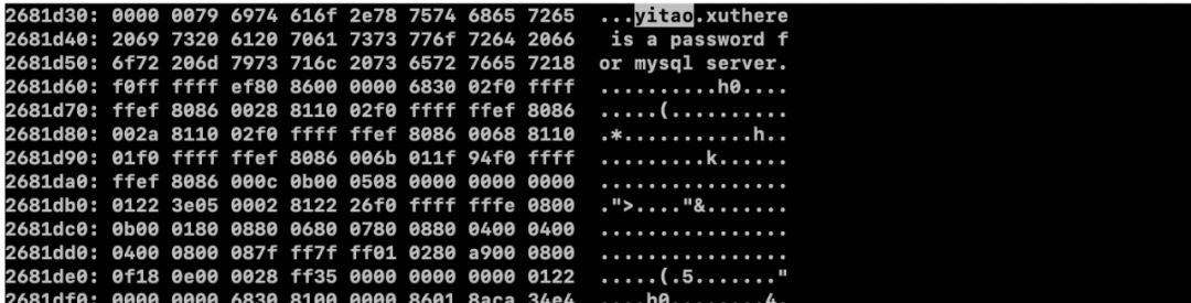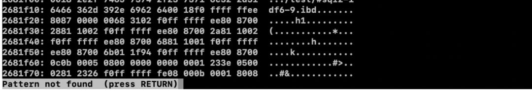 执行 xxd usr/local/mysql_old/3310/test/tde.ibd | less可以查看并检索表空间文件里是否包含刚才插入的字符。
