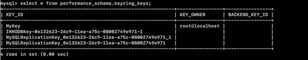 可以通过performance_schema里面的keyring_keys查看当前密钥:内容包括ID,所有者信息。