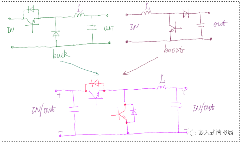 比较简单一点的话就是用一个单向buck电路与boost电路进行并联,但是成本有点高。下面我们就通过buck电路和boost电路合并成双向变换器: