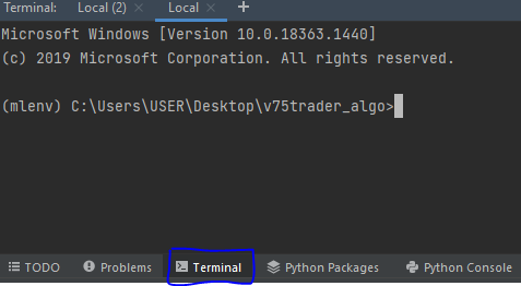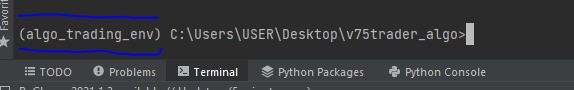 您应该在终端行的括号中看到您的虚拟环境的名称,例如 (algo_trading_env)。