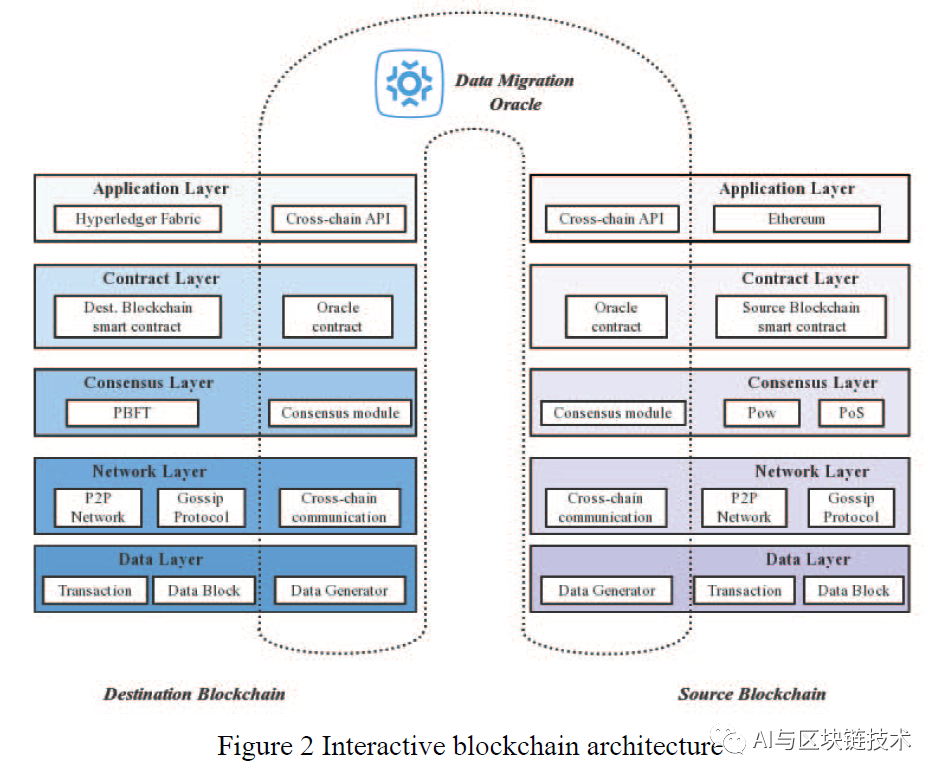 两个异构区块链之间的数据迁移涉及五个层次,有助于数据从一个区块链平滑地流动到另一个区块链。图2描述了五层体系结构,然后我们从下到上说明了每一层的功能,以及它们如何执行数据迁移过程。