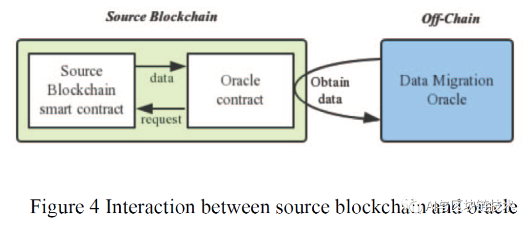 图4描述了源区块链和数据迁移oracle之间的交互。oracle收到用户的数据迁移请求后,触发部署在区块链中的oracle合约,然后oracle合约向源区块链中的实际的智能合约发出请求。通过达成共识的过程,提交的数据被加密并传输到链下oracle。