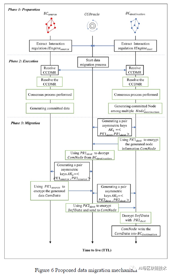 源区块链和目标区块链是分别是数据提供者和接收者。oracle充当可靠的公证人,负责接收用户的数据迁移请求,并在数据迁移过程中传递消息。数据迁移过程分为准备、执行和迁移三个阶段。预定义的条件是为后面的阶段做准备。然后两个异构区块链同时工作,生成执行阶段的提交数据和提交节点。在此基础上,最后进行迁移阶段,生成非对称密钥,保证迁移数据的机密性、完整性和私密性。综上所述,我们做出了以下贡献: