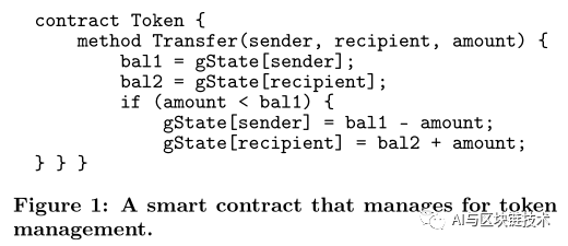 图一所示智能合约示例,包含一个从一个用户转移一定量代币到另一个用户的方法,假设用户A希望根据B最近几个月的历史余额向B发送代币。例如A仅在B的每天平均余额多余t的时候才会发送。目前不可能对此操作写一个合约方法。为了解决这个问题,A首先需要通过查询和重放所有链上交易来计算B的历史余额,然后根据结果发布转移交易。除了与区块链的多次交互产生的性能开销之外,这种方法也不安全:它无法实现交易序列化。特别地,假设A基于其对B的历史余额的计算来发布转移交易tx。但是在区块链接收到tx之前,提交另一个交易,使得B的平均余额变为t’<t。因此,当稍后提交tx时,它将基于过时状态,因此无法满足预期的业务逻辑。在具有创世币的区块链中,可串行化违规可被用于对用户造成重大经济损失的事务排序攻击。