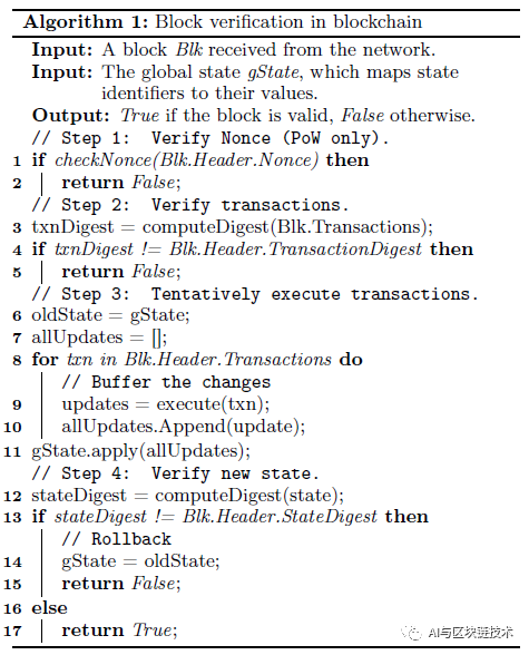 算法1说明了一个节点如何使用块头来验证它从网络接收到的块是否有效。如果该块有效,则将其追加到链中。当PoW被用于共识时,节点首先检查Nonce是否是PoW难题的正确解。如果使用确定性共识协议,如PBFT,则跳过此步骤。接下来,通过从列表中计算和验证TransactionDigest,检查交易列表是否被篡改。然后,它试探性地重新执行包含的交易。在执行期间,通过一些索引结构访问状态。执行之后,节点检查结果状态是否与StateDigest相匹配。如果有,则认为块是有效的,新的状态被提交到存储中。否则,状态将回滚到执行之前的状态。我们注意到算法1接受一个表示全局状态的对象gState作为输入。如果区块链没有分叉,例如Hyperledger,则该对象是最新状态。然而,当存在分叉时,例如在以太坊中,该对象可以引用过去某个点的全局状态。