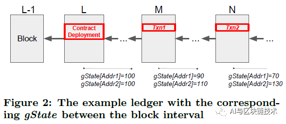 在本节中,我们使用图1所示的代币智能合约作为运行示例。图2描述了合约如何修改全局状态。特别是,该合约部署在区块链的第L个区块。两个地址Addr1和Addr2用100个代币初始化。在两个地址之间传输代币的两个交易Txn1和Txn2分别在块M和块N提交。Addr1的值从块R到块M-1是100,从块M到块N-1是90,在块N是70。全局状态gState本质上是地址和它们值的映射。