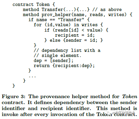 它根据输入的读和写集返回一组关联项。图3显示了代币合约的helper方法的实现。它首先从读写集计算发送方和接收方的标识符。具体来说,在write操作中值小于在read操作中值的标识符是发送方,在接收方中值正好相反。然后它返回单个元素的关联集:接收方-发送方关联。在我们的例子中,对于Txn1,这个方法返回{Addr2 : [Addr1]}。