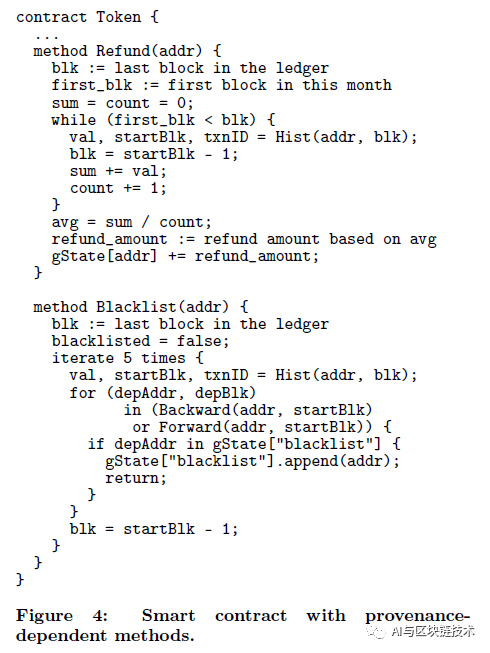 图4演示了如何使用上述API来表达智能合约逻辑,而这些逻辑目前以安全方式是不可能实现的。(vanilla Hyperledger可选地提供历史查询的historyDB。但从平面存储实现,它不提供防篡改保证,这是我们的主要贡献。)。我们在原始合约中添加了两个额外的方法,它们都使用了新的API。Refund方法是检查一个账户最近一个月的平均余额,然后根据余额进行退款。Blacklist方法将一个地址标记为黑名单,如果该地址的最后5个交易中有一个与黑名单地址有关。