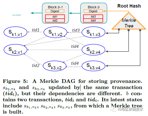 在本节中,我们将讨论LineageChain如何增强现有的区块链存储层,以便为捕获的起源提供有效的跟踪和篡改证明。我们的关键见解是将原来Merkle树中的扁平叶节点重组为Merkle DAG,然后讨论其性质。最后,我们解释了如何利用区块链执行模型来支持前向来源跟踪。