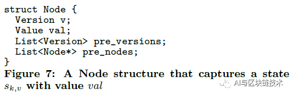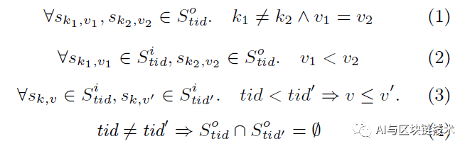 属性(1)意味着一个交易的所有输出状态的版本都是相同的,因为它们是由同一个块中的同一个交易更新的。属性(2)暗示任何输入状态的版本都严格低于输出版本。这是有意义的,因为区块链建立了交易的总顺序,并且输入状态只能在以前的交易中更新。属性(3)指出,对于所有具有相同标识符的状态,以后交易的输入永远不能有更早的版本。这确保了任何事务的输入状态在执行期间都必须是最新的。属性(4)意味着每个状态更新都是唯一的。