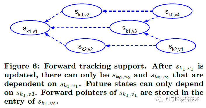 我们在这里的关键观点是,只有最新状态的向前依赖关系是可变的。一旦状态更新,由于区块链智能合约的执行模型(总是读取最新状态),前一个状态版本的前向依赖关系将成为永久的。因此,它们可以包含在起源历史中。图6展示了一个例子,在这个例子中,当状态更新为