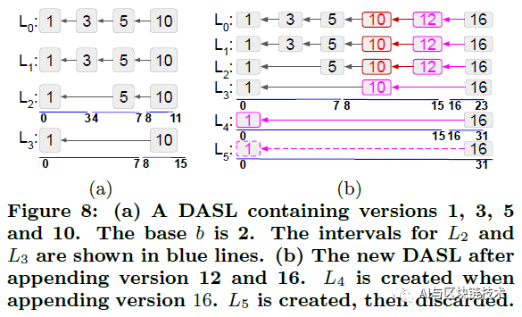 DASL和跳跃列表共享两个属性。首先,如果一个版本号出现在Li中,它也会出现在j < i的Lj中。其次,如果b = 2,假设一个版本最后出现的级别是i,那么这个版本在Li中前面的邻居出现在Lj中,其中j > i。给定这些属性,DASL中的版本查询将以与跳跃列表中相同的方式执行。更具体地说,查询尽可能遍历一个高级列表,从最后一个列表中的最后一个版本开始。只有当当前列表中的上一个版本严格小于请求的版本时,它才会移动到较低的级别。在DASL中,对