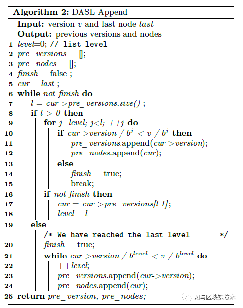 现在我们来描述一个新节点是如何附加到DASL的。挑战是确定应该包含新节点的列表。算法2详细说明了查找新节点的列表和随后是先前版本的步骤。关键思想是从L0中的最后一个节点开始,然后不断增加列表级别,直到当前节点和新节点属于同一时间间隔(第9 - 18行)。图8(b)显示了将带有版本12的节点追加到原始DASL的结果。该算法从节点10开始,向上移动到列表L1和L2。它在L3停止,因为在这个级别节点10和12属于相同的间隔,即[8,16)。因此,新节点被追加到列表L0到L2中。当算法到达最后一个级别并且仍然能够追加时,它创建一个新的级别,其中节点0是第一个条目,并重复这个过程(第21 - 24行)。在图8(b)中,当添加版本 16时,可以使用所有现有的列表。然后,该算法创建L4和节点1,并将节点16添加到它。它也创建了级别L5,但随后丢弃了它,因为节点16不会被追加,因为它属于相同的区间[0,32)与节点1。