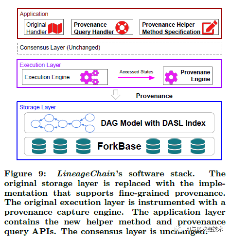 我们的工作旨在通过引入溯源来丰富区块链的功能。它与上面那些旨在提高共识协议的安全性和性能的方法是正交的。与我们最密切相关的工作是ForkBase[37]。事实上,目前的LineageChain实现是建立在ForkBase之上的,以利用它的版本跟踪功能。然而,我们在ForkBase上的创新包括多状态依赖跟踪、高效索引和用于在运行时访问源的丰富API。另一个类似的近期工作是VChain[38],研究人员在区块链数据库的历史数据上实现了布尔范围查询的完整性。但与我们不同的是,它们针对离线分析查询进行了优化。相反,我们将来源支持扩展到区块链在线交易。