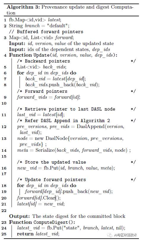 算法3详细说明了在提交块时更新状态和计算全局状态摘要的实现。使用新的状态和依赖项列表调用update函数。我们首先通过检索依赖状态的最新vids来准备反向指针列表(第5-8行)。接下来,我们为DASL索引构建指针,然后检索前一个状态的前向指针(第9行)。这些步骤的元数据被序列化,并与ForkBase中更新的值一起存储(第14-16行)。结果是更新的新vid,它被追加到每个依赖状态的前向指针列表(第18-20行)。vid现在是最新版本(第21行)。