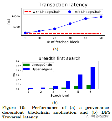 我们使用Hyperledger v1.3上的LineageChain实现进行实验,有16个节点和1个客户端。图10(a)显示了使用不同的b的交易延迟。可以看出,使用LineageChain,延迟几乎保持不变,因为客户端不需要为起源查询获取任何块。相比之下,如果没有LineageChain,延迟会随着b线性增加。这证明了在运行时访问起源信息的性能优势。