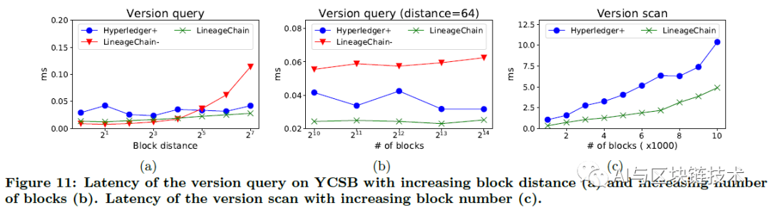 我们重复上面的实验,同时将块的距离固定为64,并改变块的总数。图11(b)显示了当块数量增加时版本查询的结果。可以看出LineageChain和Hyperledger+的查询延迟基本相同。换句话说,在这些系统中,版本查询的性能与块号无关,这是由于跟踪状态版本的DAG数据模型。LineageChain的性能优于Hyperledger+,这是因为它的索引减少了需要读取的跳跃数。一个有趣的观察是,Hyperledger+的延迟有明显波动。我们将这种变化归因于RocksDB的log-structure-merge tree索引,在该索引中,当块总数增加时,请求的版本可能位于树的不同级别。