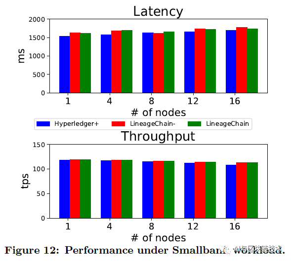 图12显示了交易延迟和总吞吐量。我们没有观察到LineageChain和其他基准之间的显著差异。特别是,交易延迟约为1.2s,吞吐量从大约118tps下降到108tps。