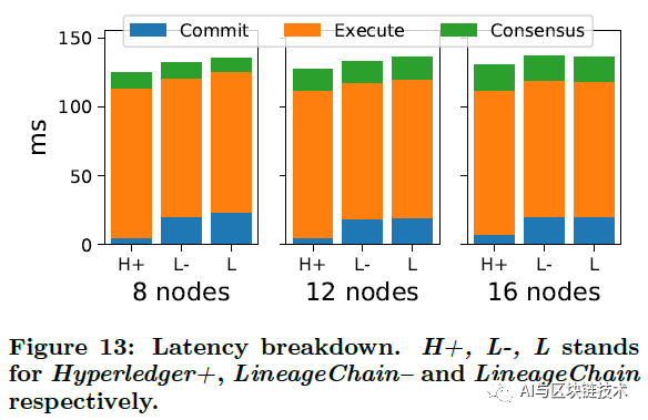 我们将块延迟分解为三个部分:共识延迟(块提议阶段)、执行延迟(事务执行时)和提交延迟(状态提交到存储时)。图13显示了节点数为8、12和16时的详细情况。可以看出,执行阶段占了成本的大部分。Hyperledger+和LineageChain在块执行时间上没有显著差异。因此,起源捕获引擎的开销可以忽略不计。