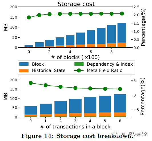 接下来,我们研究LineageChain存储成本的细分。图14显示了不同数量的块的存储细分。块大小固定为每个块500个交易。图14显示了不同块大小的细分,同时将块的数量固定在1000。可以看出,存储大小与块的数量和块大小呈线性增长。我们观察到块内容占存储成本的大部分。相比之下,额外的出处和DASL索引只占总空间消耗的2-4%。在LineageChain, DASL指针被实现为20字节的vid字符串。一个新的状态最多会添加
