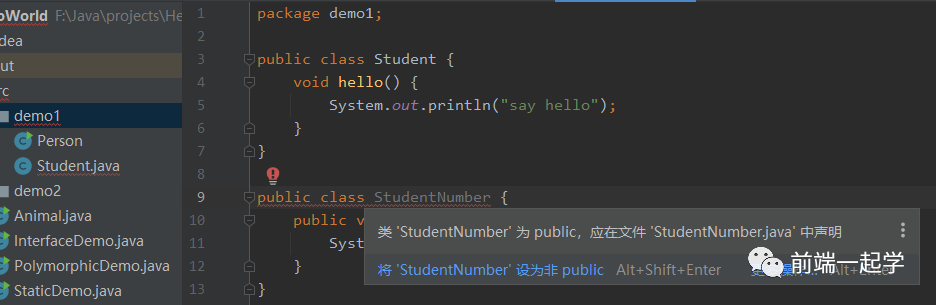 之前有说过,一个java文件只有一个public的class,没有包的话这个class不可以重复,并且非public的class也不可以重复。例如新建一个Animal2文件,保证了public的class不一致,但是在Animal2中写了个Animal中已经存在的Cat类,就有如下报错。