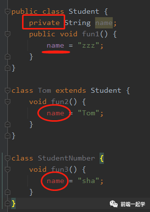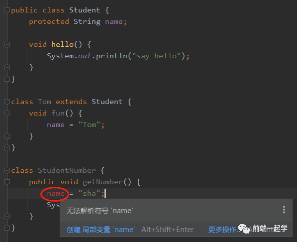 这个叫做Tom的类继承了Student类,所以Student类中定义为protected的name字段,可以在Tom类中使用。而StudentNumber这个类没有继承关系,所以访问name字段提示报错。