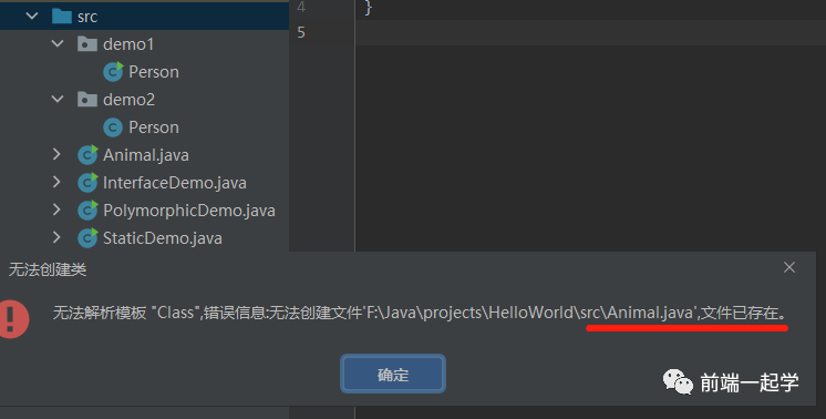 假设现在没有包的区分,src下直接新建java文件,想再创建个Animal,就会有如下报错。