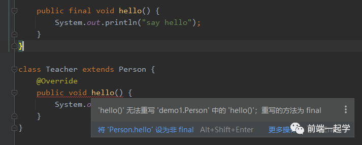 例如,Person类定义了抽象方法hello(),那么,在实现子类Student的时候,就必须覆写hello()方法。