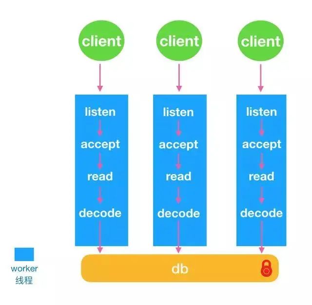 KeyDB将redis原来的主线程拆分成了主线程和worker线程。每个worker线程都是io线程,负责监听端口,accept请求,读取数据和解析协议。如图所示: