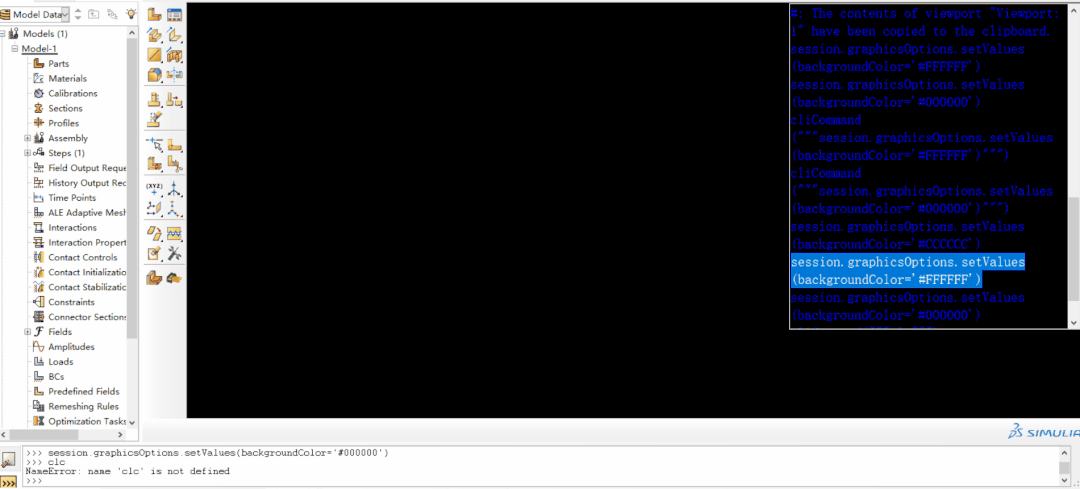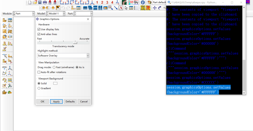 右边那个框框就是PythonReader的界面,同学们先不要被这么多命令流吓到哈,这个小软件做的特别良心,你在软件里每操作一步,小框框里就会显示相应的命令流,并进行高亮,所以我们刚开始接触Python二次开发的时候这个小软件会帮助我们不少忙。给大家示范一下:把背景换为白色