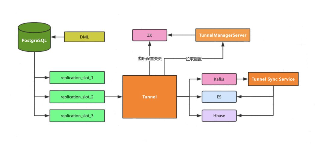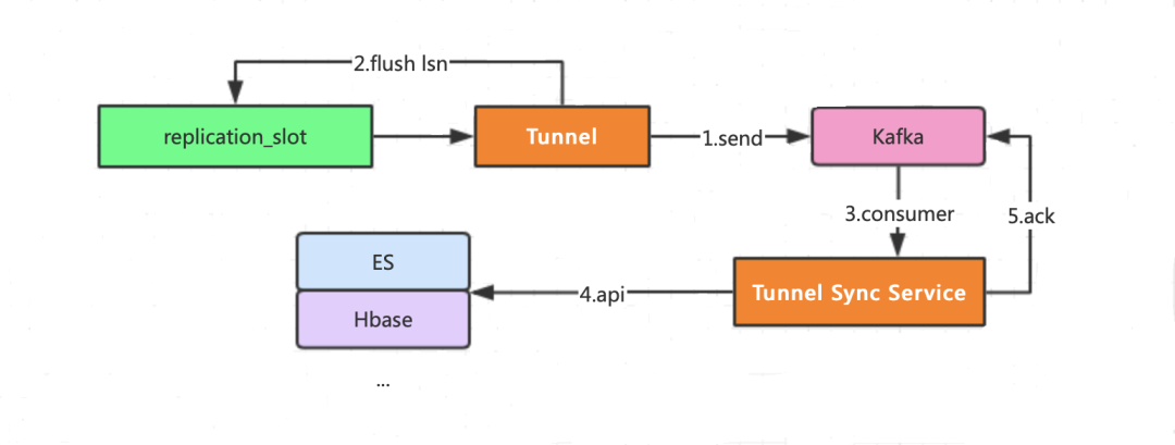 数据发送至kafka,发送成功后flush lsn,通过自动创建消费kafka的任务同步至其他数据源,如ES、Hbase、Hive等,保证同步服务的性能与可靠性。