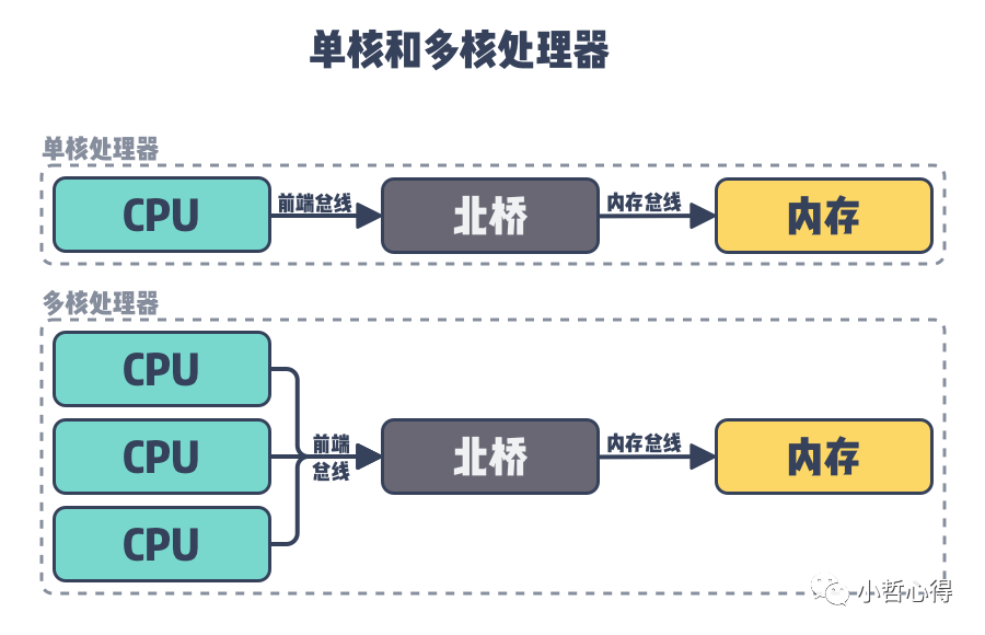 | 多个处理器都是同构的,使用相同架构的CPU | 多个处理器则可能是异构的 |