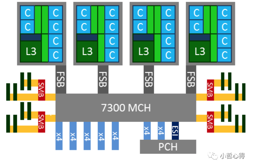 下图是一个典型的早期 x86 UMA 系统,四路处理器通过 FSB (前端系统总线, Front Side Bus) 和主板上的内存控制器芯片 (MCH, Memory Controller Hub) 相连,DRAM 是以 UMA 方式组织的,延迟并无访问差异。