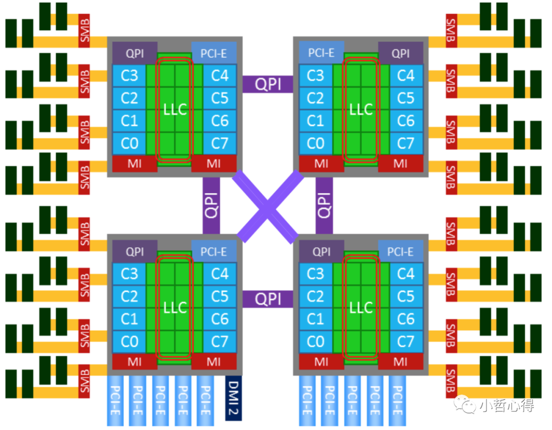在Intel x86上,NUMA Node之间的互联是通过 QPI((QuickPath Interconnect) 连接的。CPU的Uncore部分有QPI的控制器来控制CPU到QPI的数据访问。