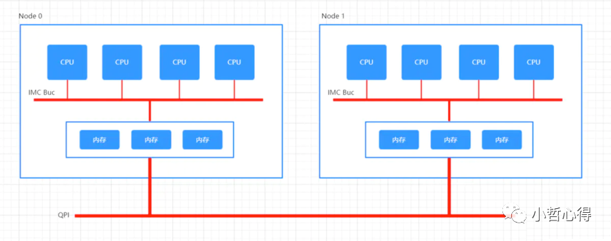 NUMA架构中,不同的内存器件和CPU核心从属不同的Node,内存控制器芯片(IMC,Integrated Memory Controller)被集成到处理器内部。在 Node 内部,架构类似SMP,使用IMC Bus进行不同核心间的通信;不同的 Node间通过QPI(Quick Path Interconnect)进行通信,如下图所示: