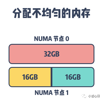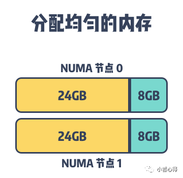 因为 MySQL 等数据库的运行会占用大量的内存,在默认情况进程会先在所在的 NUMA 节点上分配内存,当本地内存不足时,才会在远程分配内存。如上图所示,主机上包含两个 NUMA 节点,其中每个节点都有 32GB 的内存,但是当 MySQL InnoDB 的缓存池占用 48GB 的内存时,它会在 NUMA 节点 0 和 NUMA 节点 1 分别分配 32GB 和 16GB 的内存。
