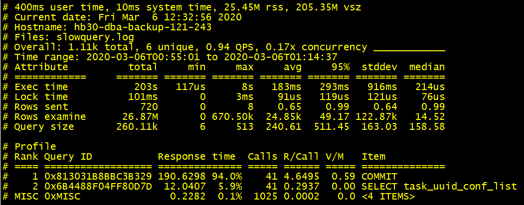 有慢日志了就进行优化吧,但是这个慢日志报告让我有些懵,可以看到里面94%的响应时间是在处理commit的请求。