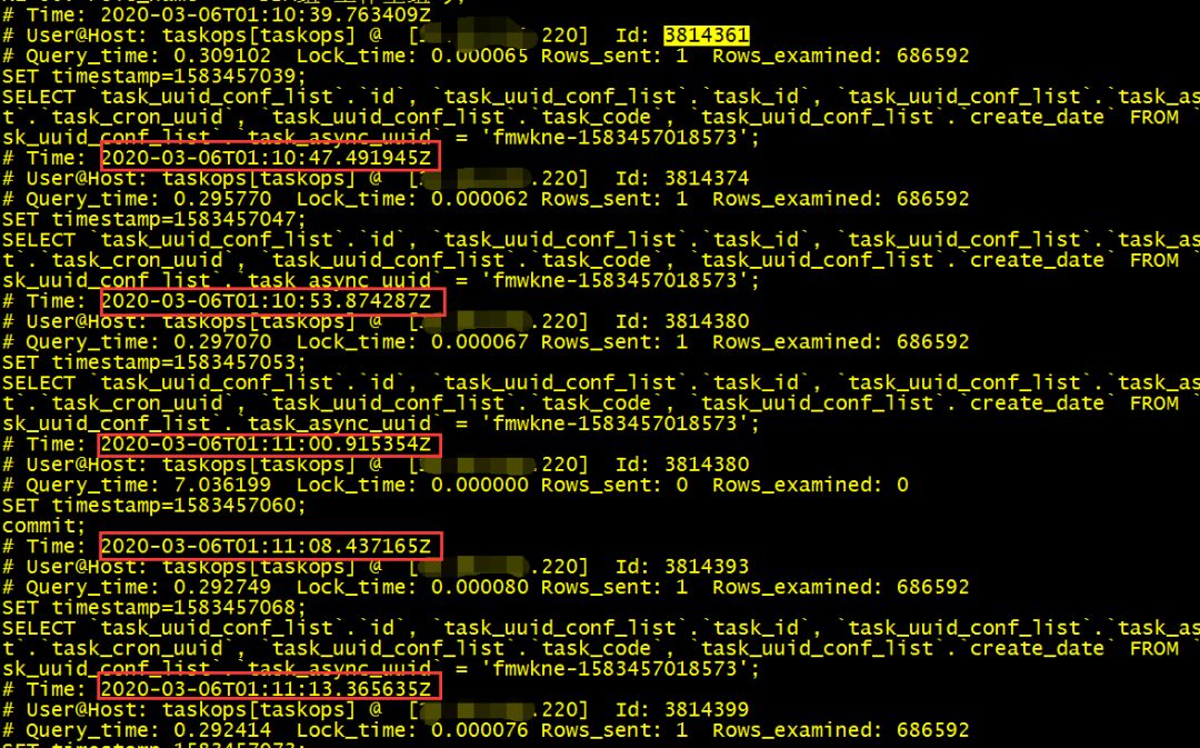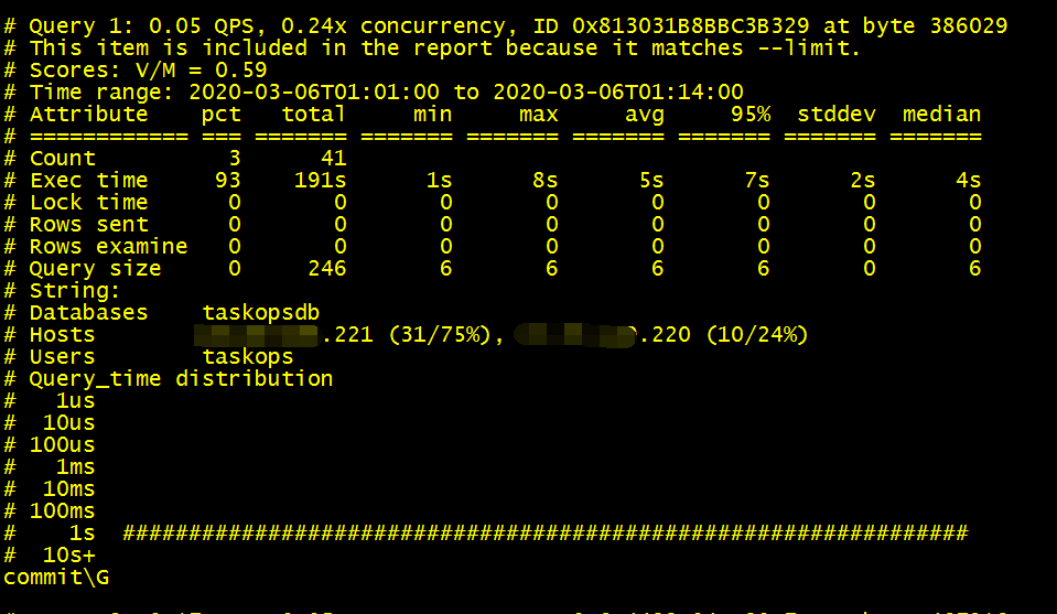 两个节点的数据同步,基本是这样的场景,taskopsdb的短时间产生了大量的慢日志,而这些慢日志的表现是commit,这个commit的本质其实不是taskopsdb里面存在大量的commit操作,而是因为其他原因,导致原本无害的commit操作产生了堆积或者阻塞。所以commit的部分只是表象。