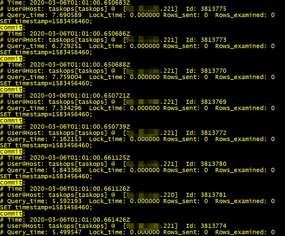 我们直接看下commit相关的SQL吧,结果打开一看慢日志文件,基本就是这样的输出结果,既然是慢日志,那么影响的数据行数应该是比较明显的,但是这里看到“Rows_examined”和“Rows_sent"都是0,但是很直白的是commit的执行时间依旧很长。