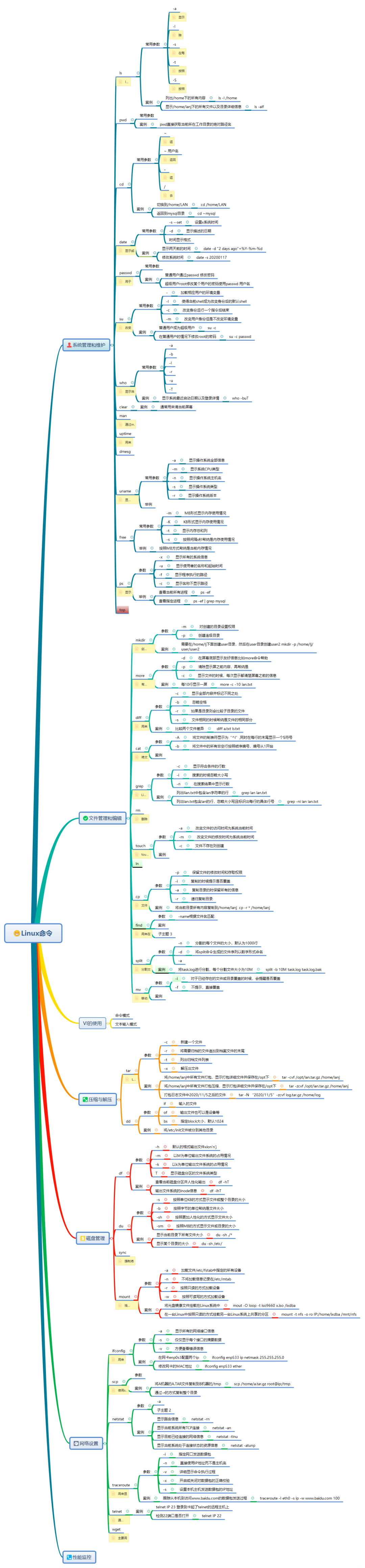 命令太多,必须要全部记忆,但是要学会如何查每个命令的参数。我画了个思维导图可以当作小字典查看,下面列出可能我们使用频率会更高的命令