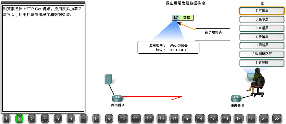2. 浏览器发出HTTP Get请求。应用层添加第7层报头,用于标识应用程序和数据类型。
